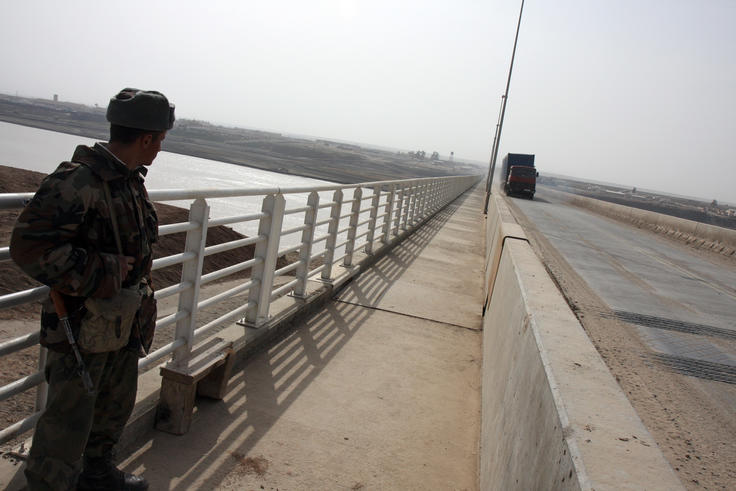 A Tajik border guard keeps watch on a bridge over the river Piandj on the Tajik-Afghan border, 29 February 2008.