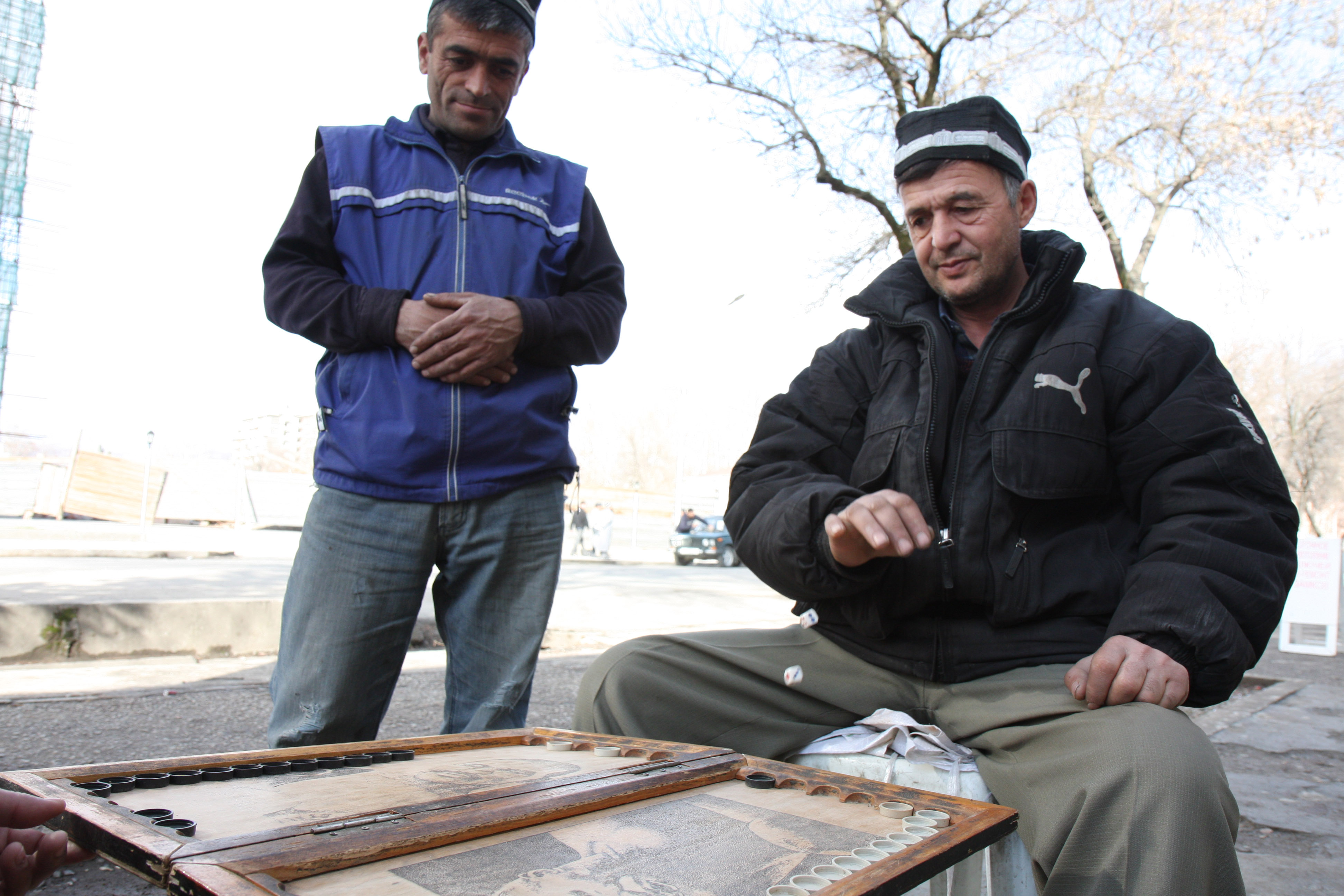 Tajik men play backgammon in the street in Dushanbe, 1 March 2008.