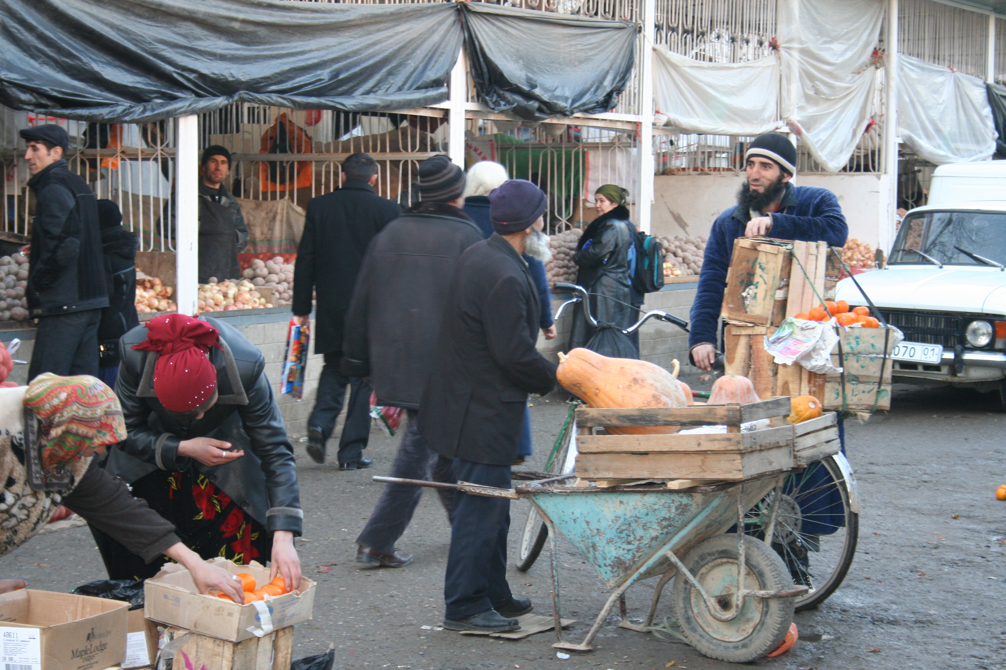 Two men stop for a discussion at the open-air market in Dushanbe, February 2008.