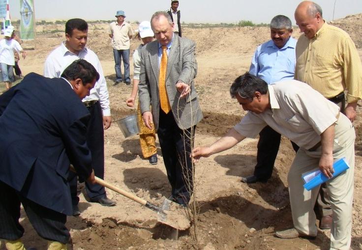 Head of the OSCE Centre in Dushanbe, Ambassador Vladimir Pryakhin (centre), helps local government officials plant a tree in one of two fruit orchards donated by the Centre, Shaartuz, Tajikistan, 26 March 2008.