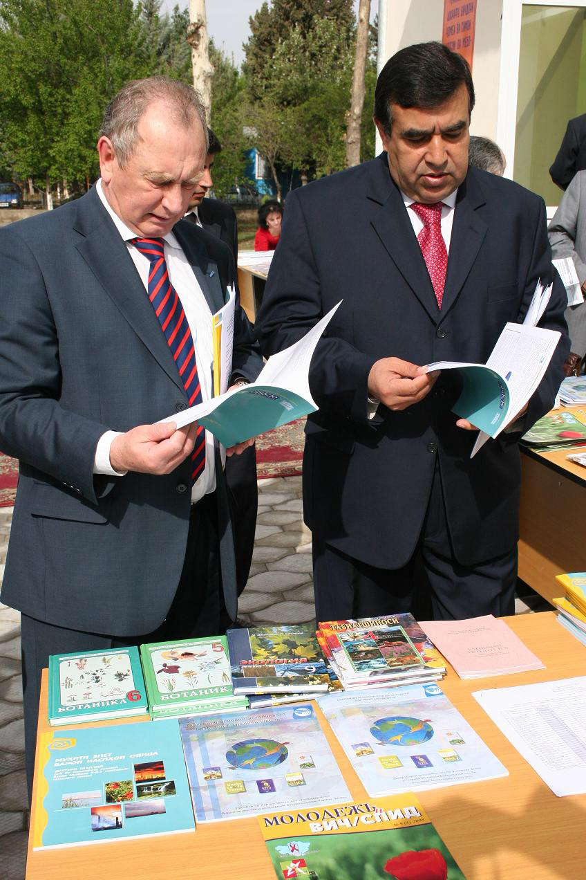 Ambassador Vladimir Pryakhin (left) and Education Minister Abdujabbor Rakhmonov look at samples of a text book for schools on ecological education, in Dushanbe, 9 April 2008.