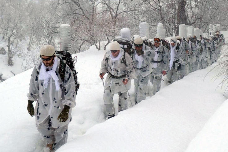 Afghan students and their instructors take part in a high-altitude training exercise in preparation for two weeks of winter training on survival, mountaineering, search and rescue, avalanche awareness, and snow analysis in Khoja Obigarm, 50 kilometers north of Dushanbe, 12 February 2013.