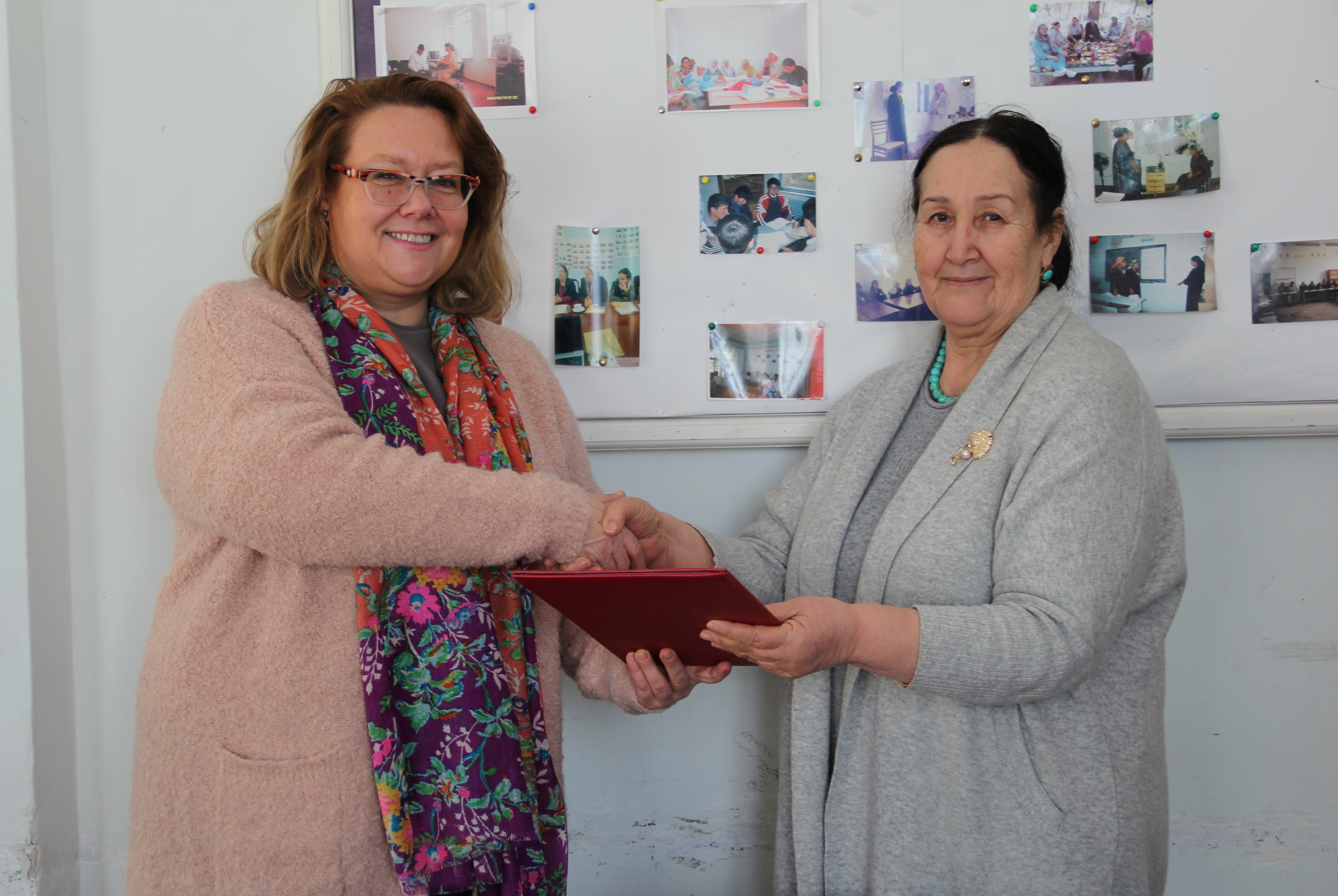 Туула Юрёля, Роҳбари Дафтари САҲА дар Тоҷикистон (аз тарафи чап) ва Муаззама Усмонова, Директори ТҶ «Оксана» (аз тарафи рост) шартномаи нав оид ба амалигардонии лоиҳаҳоро ба имзо мерасонанд, ноҳияи Ҷалолиддини Балхии вилояти Хатлон, 3 марти соли 2017.