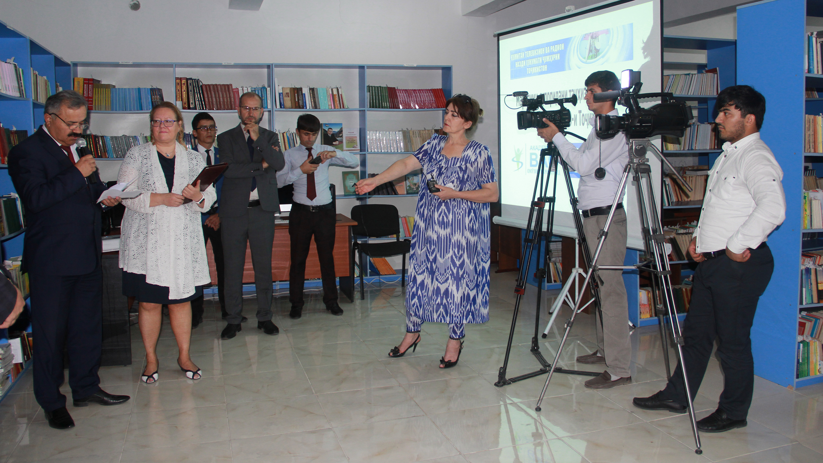 Аз рост ба чап: Маҳмадшариф Бобошоҳзода, муовини аввали раиси Кумитаи телевизион ва радиои Ҷумҳурии Тоҷикистон, Сафир Туула Юрёля, Роҳбари Дафтари Барномаҳои САҲА дар Душанбе, Фаррухшо Ҷунайдов, Мутахассиси маҳалли оид ба рушди ВАО, Дафтари Барномаҳои САҲА дар Душанбе дар маросими супоридани таҷҳизоти техникӣ ба Академияи ВАО-Тоҷикистон, Душанбе, 15-уми сентябри соли 2018.