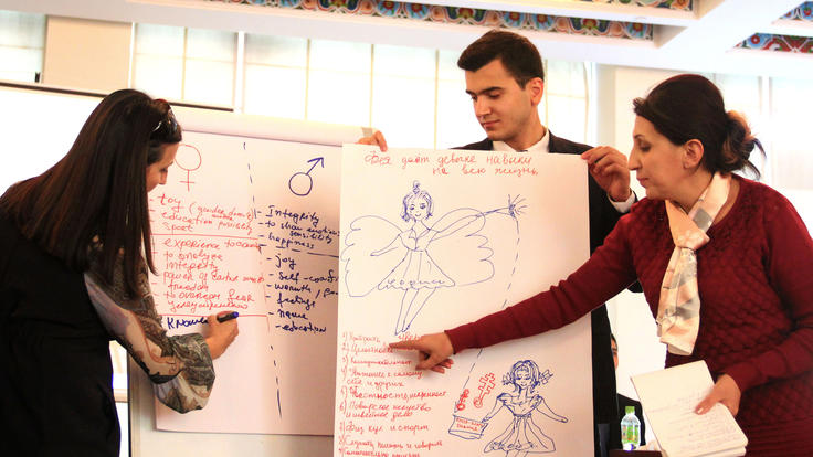 Весна Иванович-Кастаред, корманд оид ба масъалаҳои гендерӣ ва мубориза бо савдои одамони Дафтари барномаҳои САҲА дар Душанбе (аз тарафи чап) ва иштирокчиён ҳангоми машғулияти амалӣ дар тренинги омӯзишӣ барои тренерон дар мавзӯъи пешгирии низоъ бо дарназардошти омили гендерӣ, Душанбе, 19 октябри соли 2018.