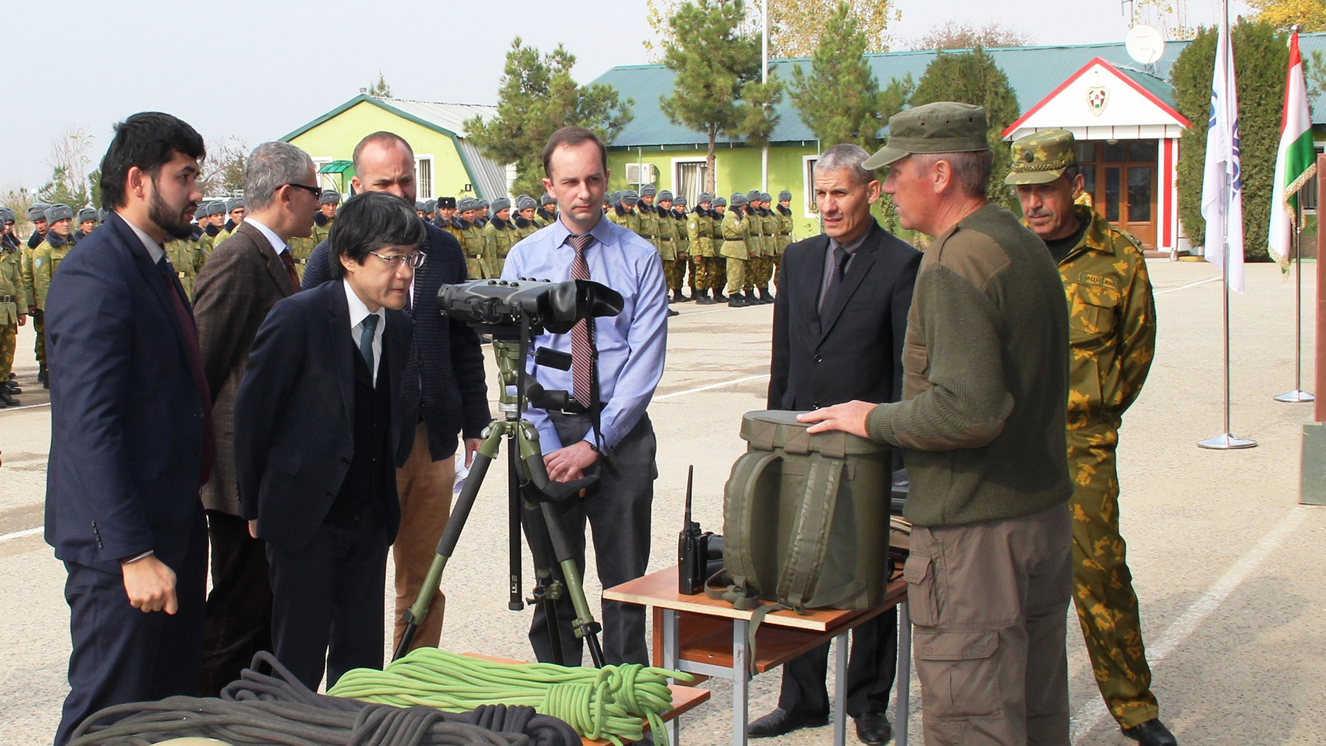 Андрей Гупалов, Корманди робитаҳо бо аҳли ҷомеаи Лоиҳаи таҳкими иқтидори посбонӣ дар маҳалҳо (аз тарафи рост) ба меҳмонон дар рафти маросими ифтитоҳи лоиҳа маводҳои омӯзиширо нишон медиҳад, Маркази минтақавии омӯзишии Ҳалқаёр, 12 ноябри соли 2018.