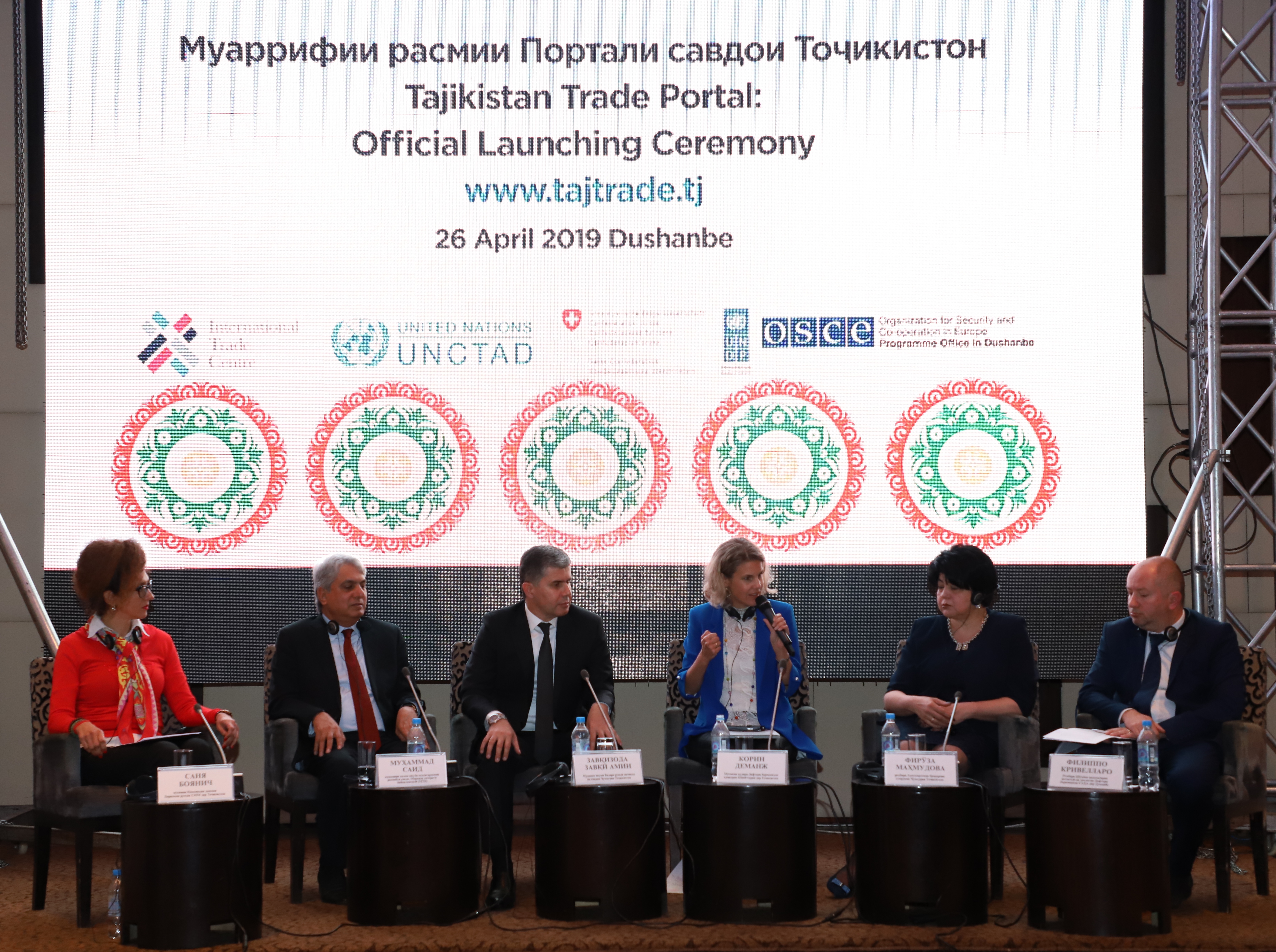 Намояндагони Ҳукумати Тоҷикистон ва созмонҳои байналмилалӣ дар маросими оғози расмии Портали тиҷоратии Тоҷикистон, Душанбе, 26 апрели соли 2019.
