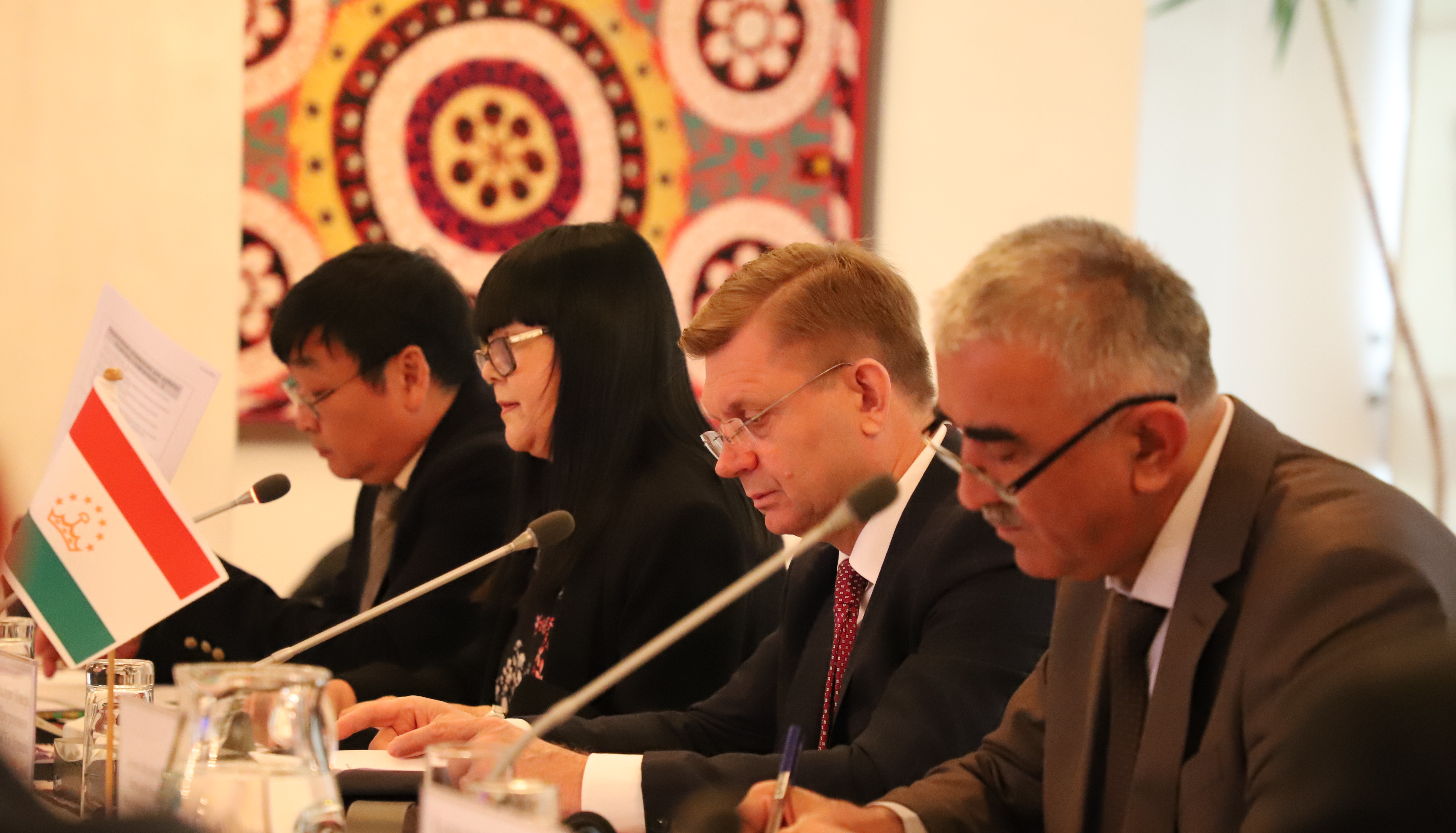 (Аз тарафи чап ба рост) Вадим Ни, мушовири САҲА; Муҳаббат Камарова, мушовири миллии муҳитзистии Дафтари барномаҳои САҲА дар Душанбе; Валериу Кивер, роҳбари Дафтари барномаҳои САҲА дар Душанбе ва Абдусалим Ҷӯраев, сардори Раёсати мониторинг ва сиёсати экологии Кумитаи ҳифзи муҳити зист, Душанбе, 13 ноябри соли 2019.