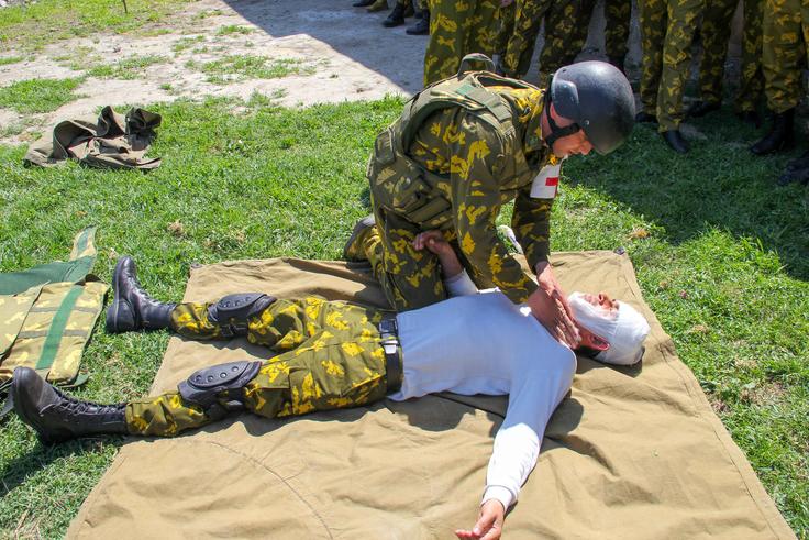 Иштирокчиёни курси омӯзишӣ ҳангоми машқи амалӣ оид ба расонидани кӯмаки аввалия ҳангоми бардоштани ҷароҳат дар майдони ҷанг, ноҳияи Спитамен, 21 апрели 2021.