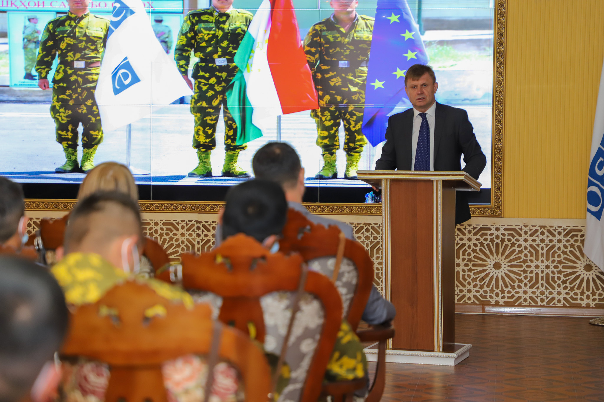 Сафир Валериу Кивер, роҳбари Дафтари барномаҳои САҲА дар Душанбе ҳангоми баромадаш дар назди иштирокчиёни курси омӯзишӣ, шаҳри Хоруғ, 1 июни 2021.