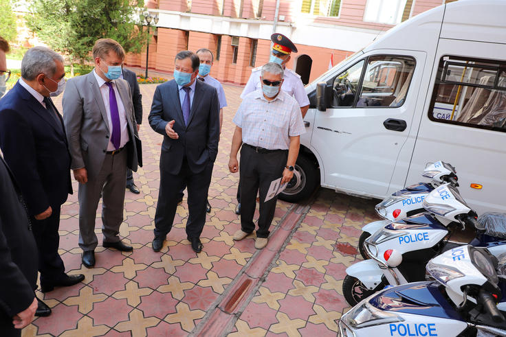 Генерал-полковник Раҳимзода Рамазон Ҳамро, Вазири корҳои дохилии Тоҷикистон (дар мобайн аз рост) ва Валериу Кивер, Роҳбари Дафтари барномаҳои САҲА дар Душанбе (дар мобайн аз чап) дар ҷараёни маросими тақдими се микроавтобус ва панҷ скутери барқӣ, Душанбе, 17 июни соли 2021.