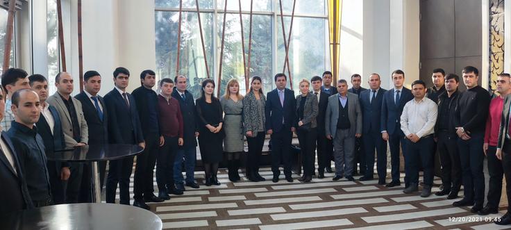 Намояндагони Хадамоти гумрук ва Маркази экспертизаи кимиёӣ, биологӣ, радиатсионӣ ва ҳастаии Тоҷикистон дар семинари чоррӯза оид ба назорати стратегии тиҷорат дар Тоҷикистон, Душанбе, 20 декабри соли 2021.