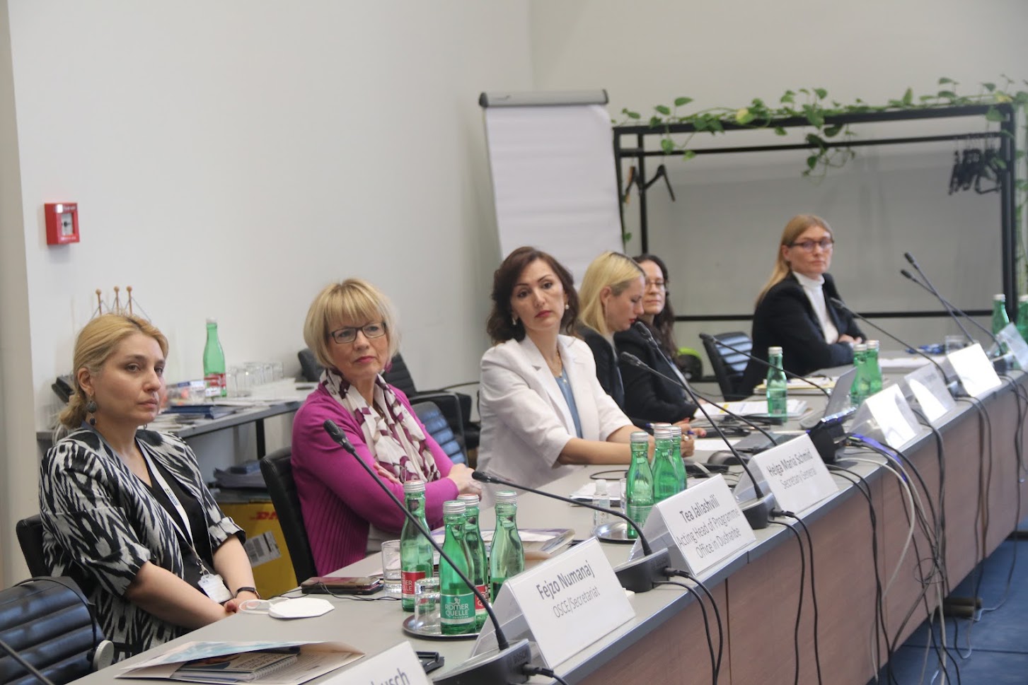Дабири кулли САҲА Ҳелга Мария Шмид (дар мобайн) дар мизи мудаввар оид ба ворид намудани усули баназаргирии масоили гендерӣ ҳангоми таъмини амнияти сарҳадӣ, 2 сентябри соли 2022, шаҳри Вена.