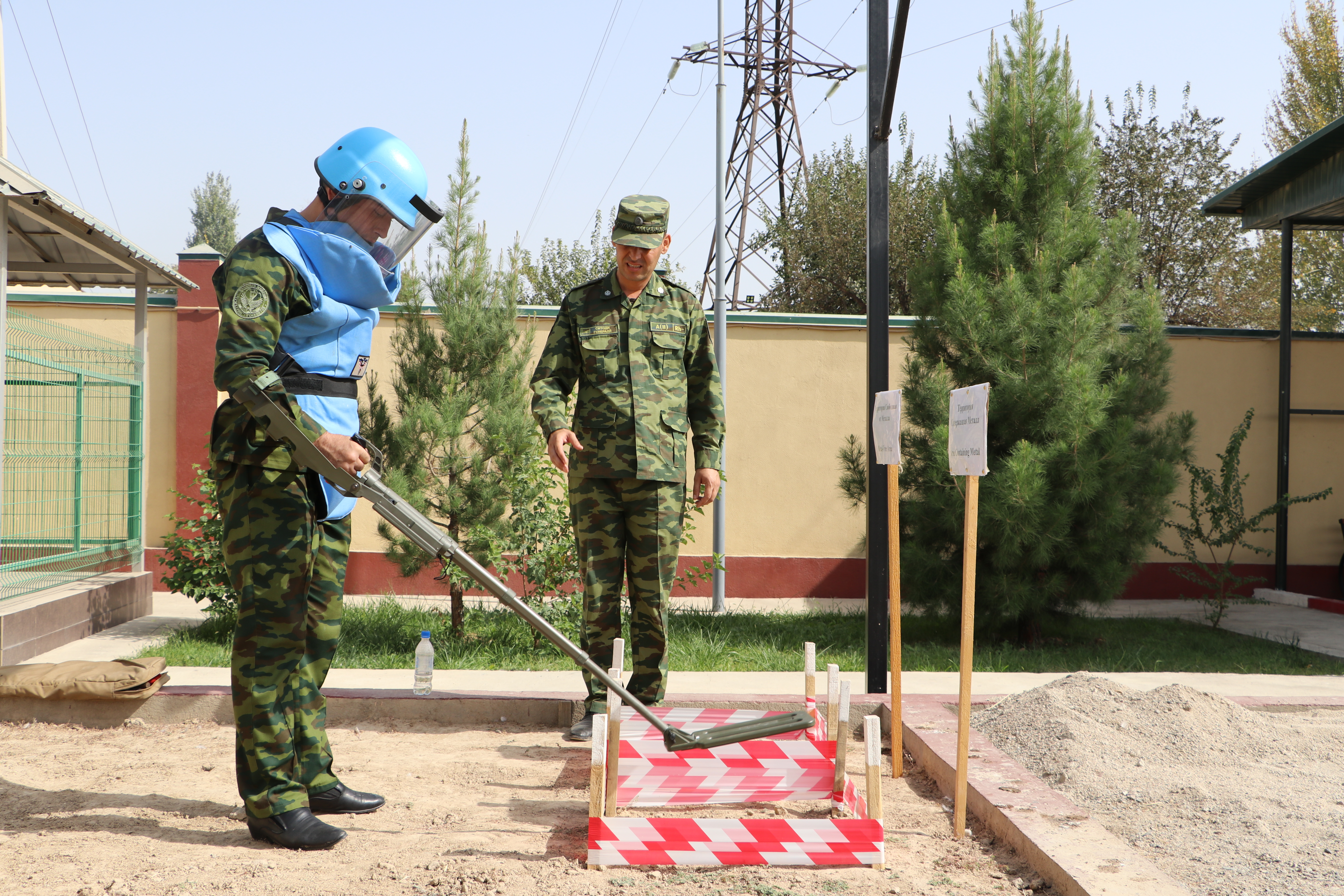 Мутахассисони безараргардонии маводи тарканда аз Вазорати мудофиаи Тоҷикистон дар рафти курси чорҳафтаинаи таълимии минтақавии безарарсозии маводи тарканда (сатҳи 2-юм) дар Чимтеппа, Тоҷикистон, 17 октябри соли 2022.