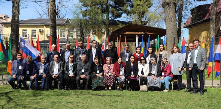 Роҳбарон ва кормандони Марказҳои захиравии занон, ки аз ҷониби САҲА дастгирӣ мешаванд, зимни аксбардории гурӯҳи бо намояндагони САҲА дар ҷараёни курси якҳафтаинаи таълимии стратегияи рушди тиҷорат, Душанбе, 17 марти соли 2023.