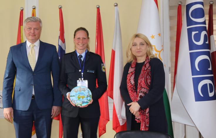 (аз чап ба рост) Ихар Кузьминич, Сардори Шуъбаи омӯзиш ва таълими Коллеҷи САҲА барои ҳайати роҳбарикунандаи сарҳадӣ; Беате Шмидт, Муовини Менеҷери сатҳи миёна аз Олмон ва Тея Ҷалиашвили, Иҷрокунандаи вазифаи Роҳбари Дафтари барномаҳои САҲА дар Душанбе дар маросими хатми курси 34-ум барои ҳайати сарҳадбон, Душанбе, 24 марти соли 2023.