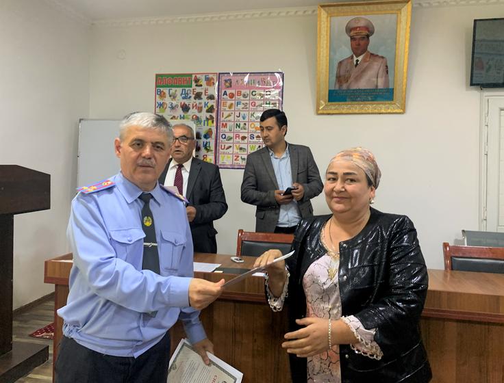 Узви Шӯрои ҷамъиятӣ оид ба ислоҳоти милитсия зимни тақдими Сипоснома барои хизматҳои ҳамкории милитсия ва ҷомеа дар ноҳияи Қубодиёни вилояти Хатлон, 10 апрели соли 2023.