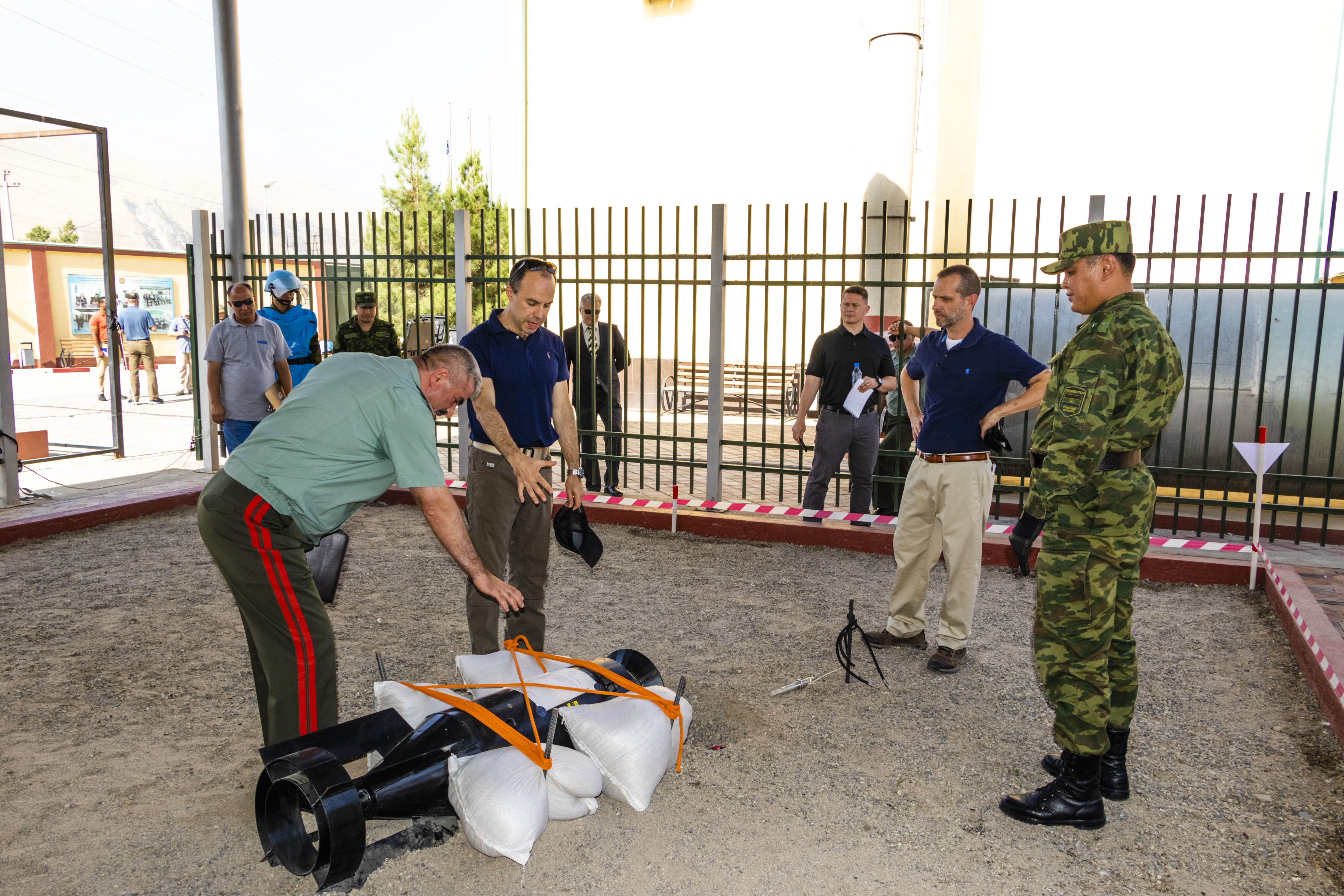 Полковник Сулаймон Қодирзода (аз чап), директори Маркази таълимии минтақавии безарарсозии маводи таркандаи Вазорати мудофиаи Ҷумҳурии Тоҷикистон ва подполковники Артиши ИМА Виталий Гелфгат (аз чап), сардори Раёсати ҳамкориҳои ҳарбии Сафорати ИМА дар Душанбе ба Ҳайати намояндагони Конгресси ИМА дар ҷараёни мушоҳидаи тарзи истифодаи таҷҳизоти безараргардонии минаҳо дар рафти омӯзиши безарарсозии маводи тарканда, Чимтеппа, канори Душанбе, 11 августи соли 2023.