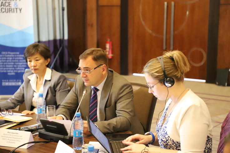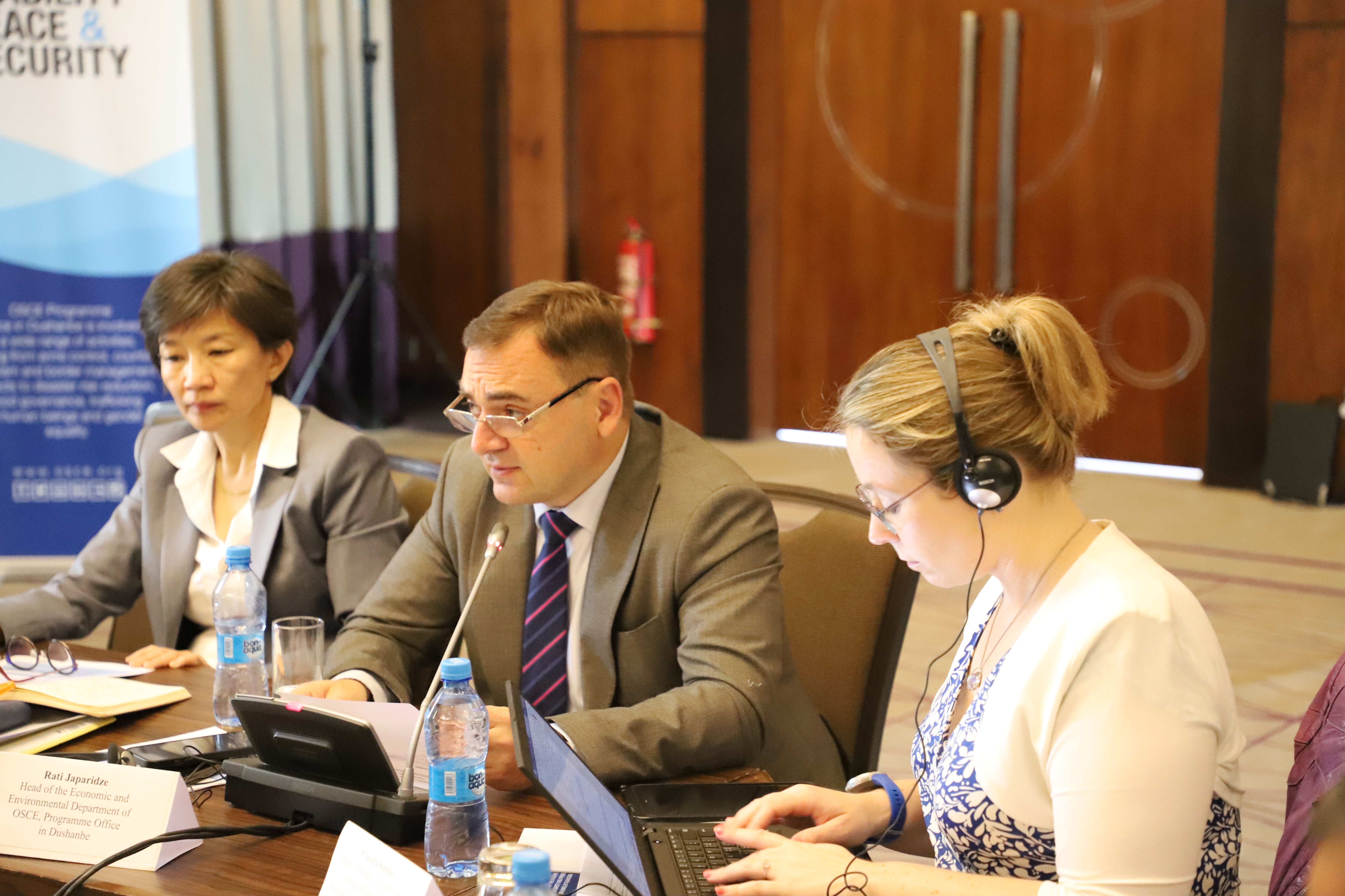 Рати Ҷапаридзе (дар мобайн), роҳбари Шӯъбаи иқтисодӣ ва экологии Дафтари барномаҳои САҲА дар Душанбе ва Сарангоо Раднаарагчаа (аз чап), Мушовири минтақавӣ оид ба муҳити зист дар Комиссияи иқтисодии Созмони Милали Муттаҳид (UNECE) дар маросими ифтитоҳи Ҷаласаи гурӯҳи корӣ оид ба бехатарии партовгоҳҳо ва пешгирии олудашавии об, Душанбе, 15 майи соли 2024.