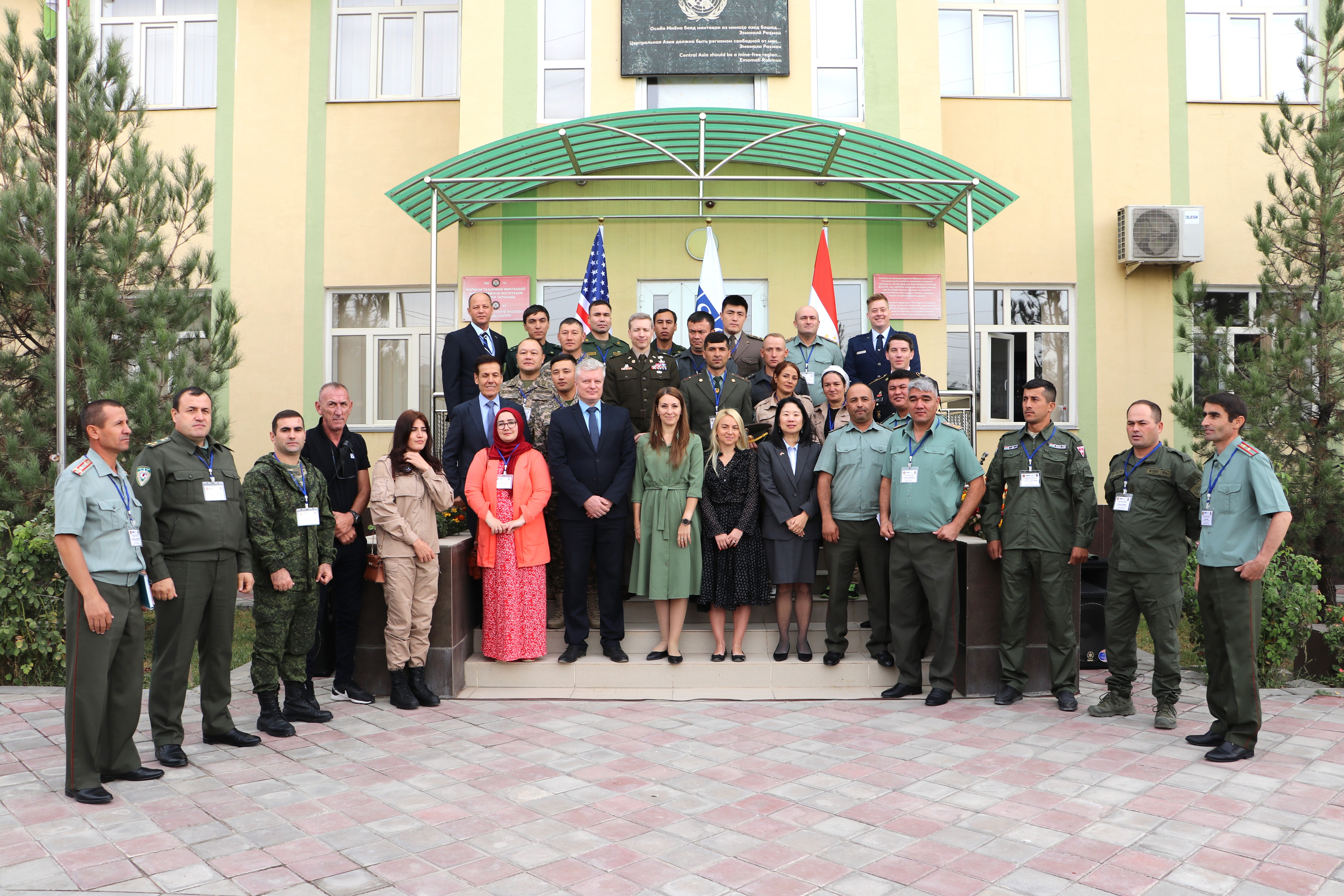 Масъулини Вазорати мудофиаи Ҷумҳурии Тоҷикистон, Артиши марказии Иёлоти Муттаҳида ва намояндагони САҲА зимни аксбардорӣ бо иштирокчиёни курси таълимии сеҳафтаинаи минтақавии безарарсозии маводи тарканда (Сатҳи 1), Чимтеппа, канори Душанбе, 16 сентябри соли 2024.